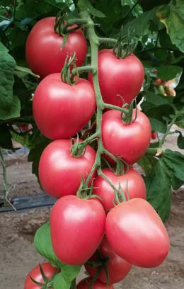 Pink saladette tomato with strong plant and short internodes. Good leaves coverage with high productivity during the cycle. Cluster made of 6-8 fruits, pink when ripe, firm with high homogeneity for size. Good long shelf life in post-harvesting.
